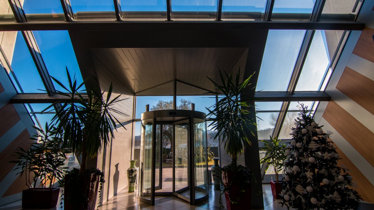 Uno degli aspetti che più risaltano è senz'altro la porta girevole in alluminio e vetro posta all'ingresso della struttura, la quale si va ad incastonare al centro della facciata obliqua, creando un elemento di discontinuità.