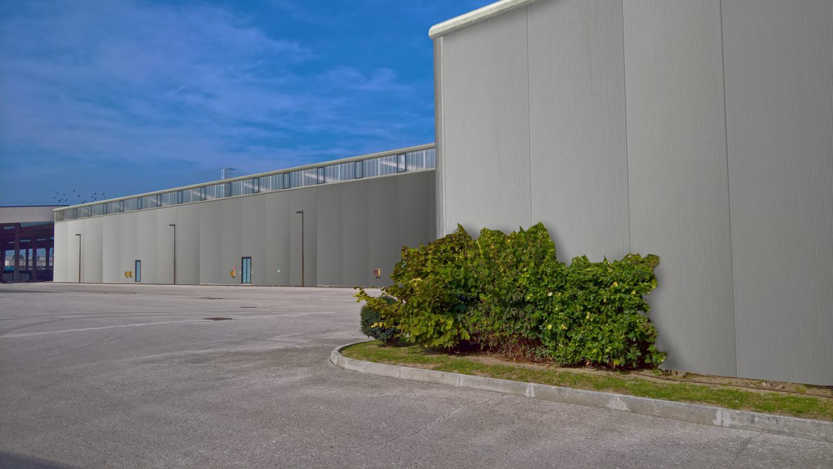 All'ingresso, come ad accogliere i clienti, un imponente cancello in acciaio e vetro con al centro il logo serigrafato dell'azienda.