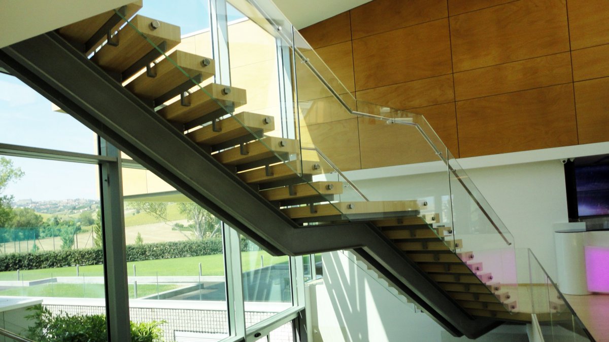 Vengono qui messi in evidenza alcuni significativi dettagli della sede della Rainbow. Vetro e acciaio inox combinati insieme creano la giusta eleganza attribuendo alla struttura l'importanza che le compete.