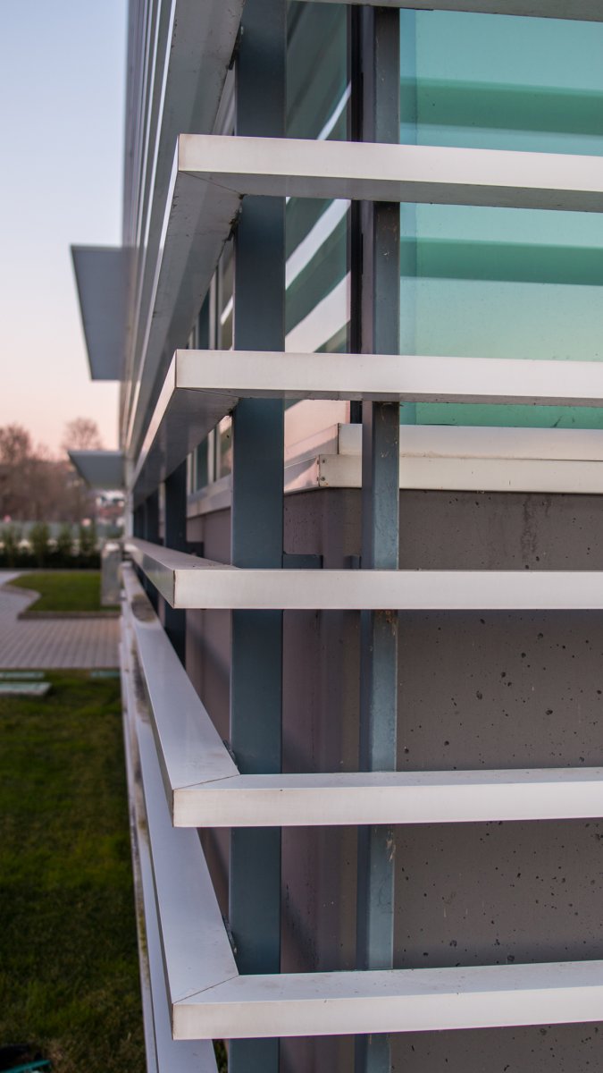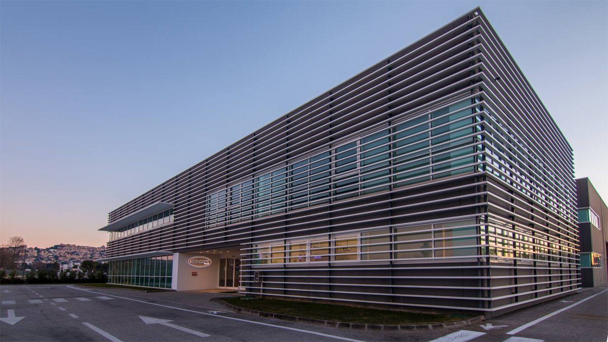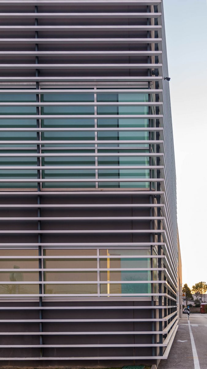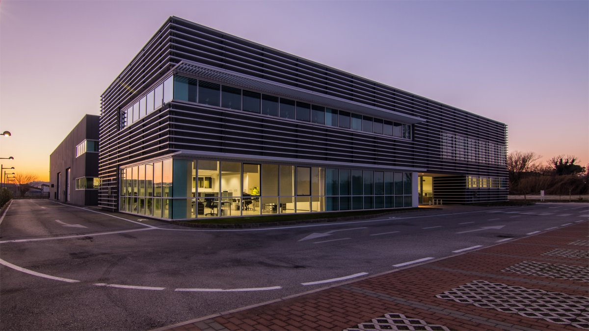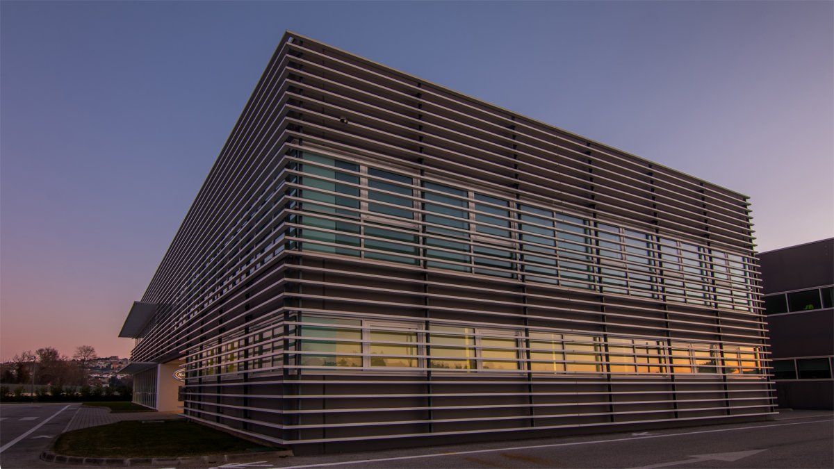 Situata nel tratto di strada che collega i due Comuni di Castelfidardo e Recanati, la nuova sede di Acquambiente Marche presenta alcuni tratti architettonici distintivi, a cominciare dalla facciata anteriore in cui sono situati, ad intermittenza regolare, lunghi frangisole che la ricoprono quasi interamente, fornendo al tempo stesso una protezione dai raggi solari.