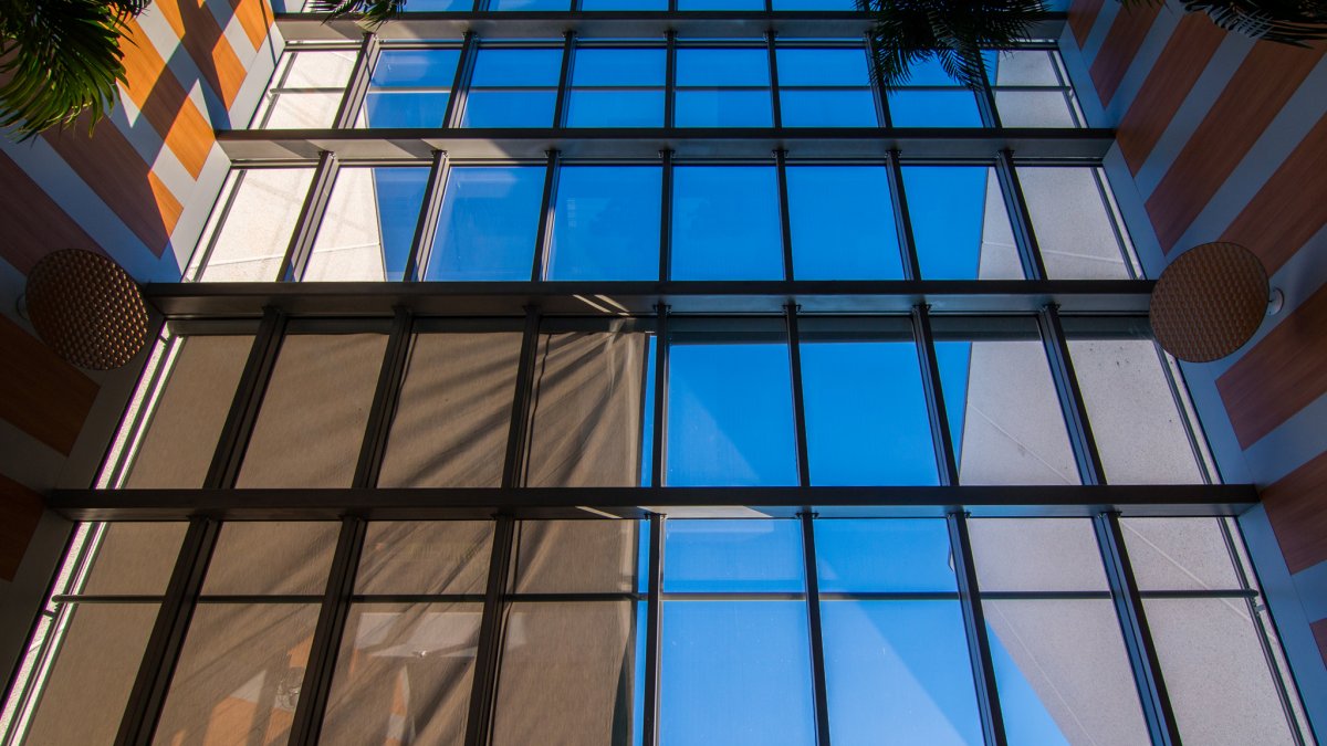 Uno degli aspetti che più risaltano è senz'altro la porta girevole in alluminio e vetro posta all'ingresso della struttura, la quale si va ad incastonare al centro della facciata obliqua, creando un elemento di discontinuità.