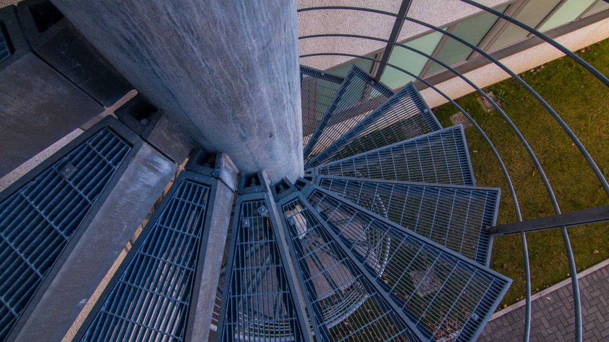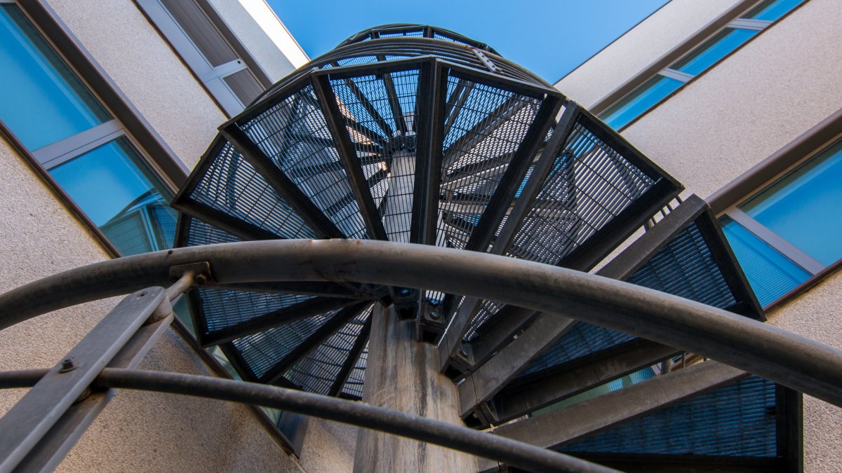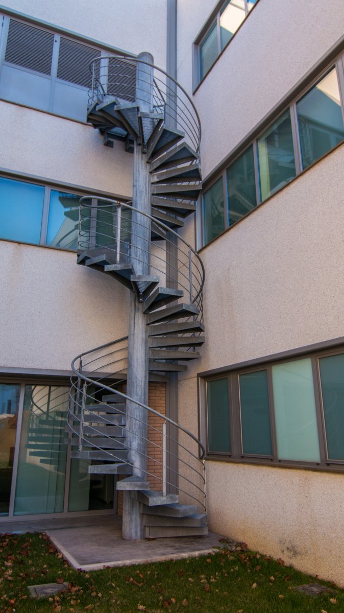 Da notare anche la scala esterna a chiocciola realizzata con scalini in grigliato zincato che, posta in un angolo, riesce in poco spazio a coprire un'altezza che le permette diarrivare al secondo piano della struttura.
