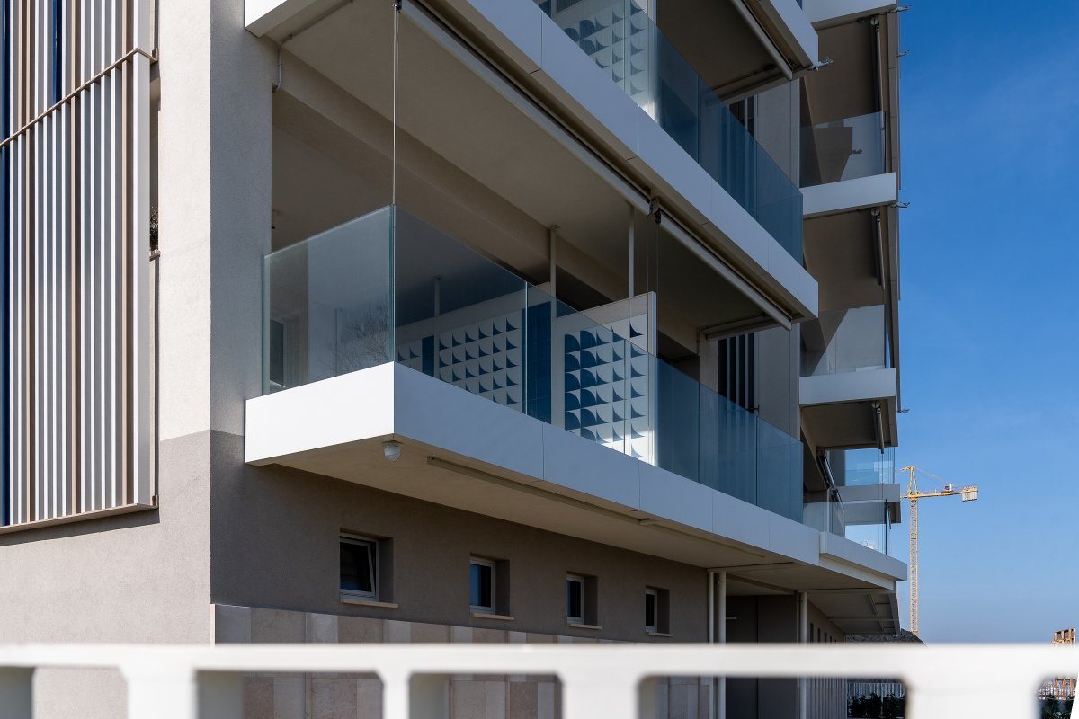 Nelle pareti laterali degli edifici, si possono notare i colorati frangisole verticali. Che oltre ad avere una funzione di attenuazione della luce solare, offrono un particolare gioco di luci e colori, soprattutto nelle giornate di sole