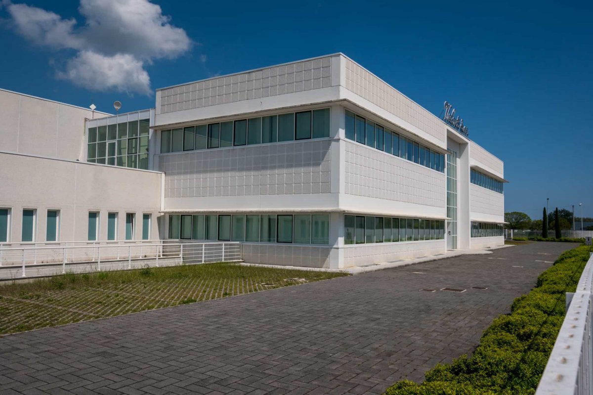 Sede del polo produttivo e logistico, la struttura ha un involucro molto semplice e pulito, prevalentemente di colore bianco, sulla quale spiccano gli infissi in alluminio e vetro presenti nella parte anteriore e nella zona dell'ingresso, caratterizzato da una facciata continua centrale.