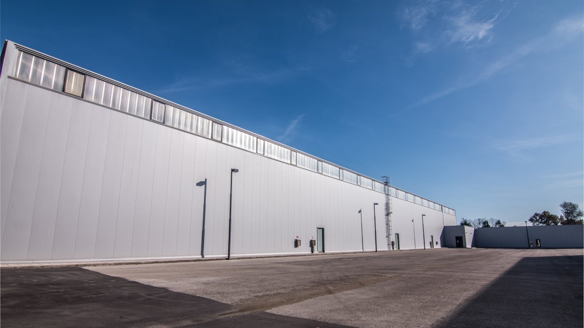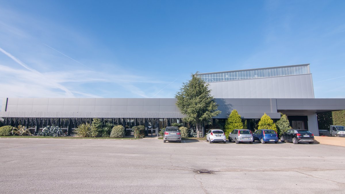 All'ingresso, come ad accogliere i clienti, un imponente cancello in acciaio e vetro con al centro il logo serigrafato dell'azienda.