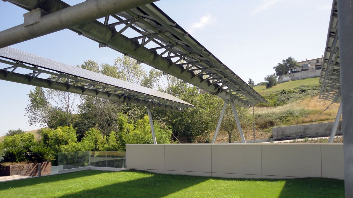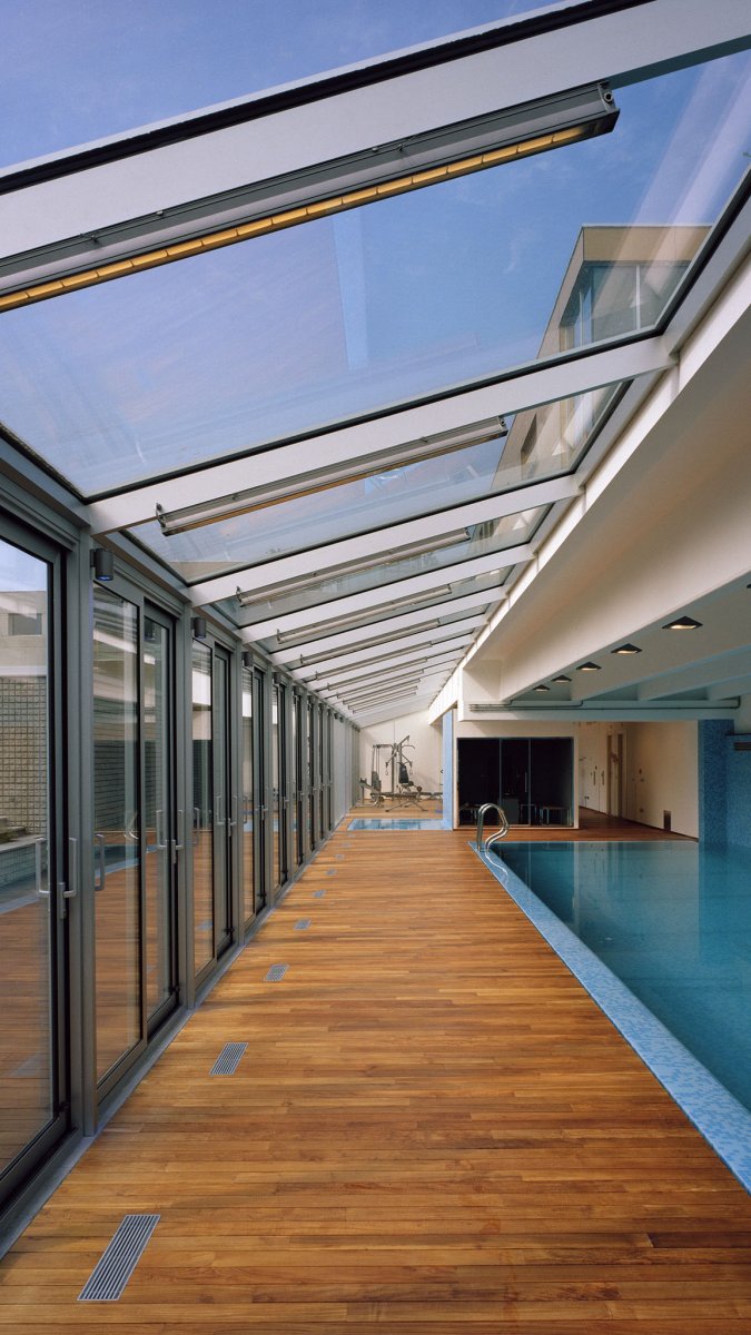 La zona relax caratterizzata da grandi facciate continue in alluminio e vetro che si sviluppano sia in copertura che nelle pareti offre all'ambiente grande luminosità, creando al tempo stesso una sensazione di open space.