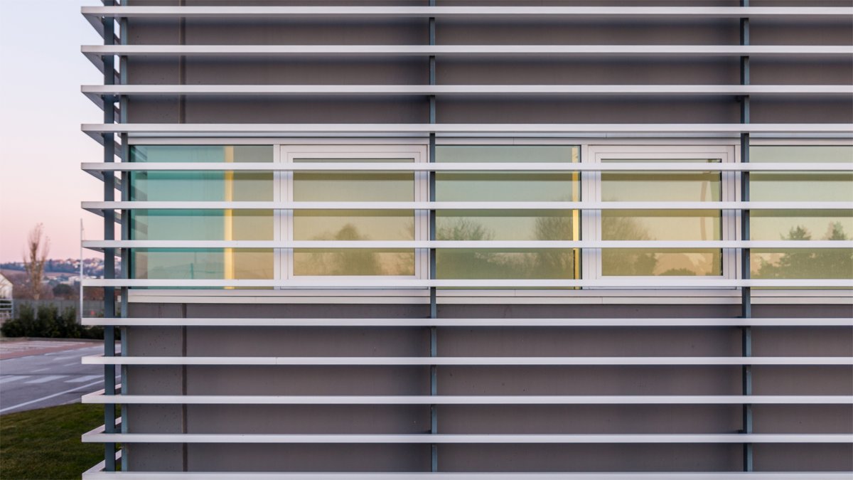 Situata nel tratto di strada che collega i due Comuni di Castelfidardo e Recanati, la nuova sede di Acquambiente Marche presenta alcuni tratti architettonici distintivi, a cominciare dalla facciata anteriore in cui sono situati, ad intermittenza regolare, lunghi frangisole che la ricoprono quasi interamente, fornendo al tempo stesso una protezione dai raggi solari.