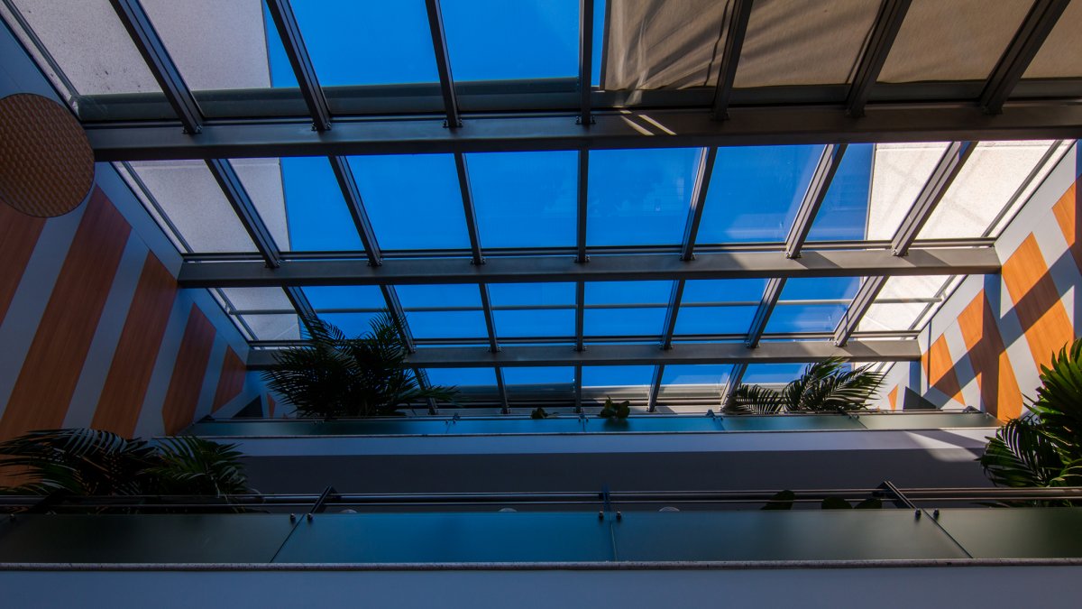 Uno degli aspetti che più risaltano è senz'altro la porta girevole in alluminio e vetro posta all'ingresso della struttura, la quale si va ad incastonare al centro della facciata obliqua, creando un elemento di discontinuità.