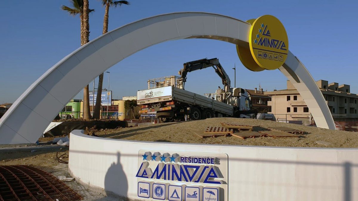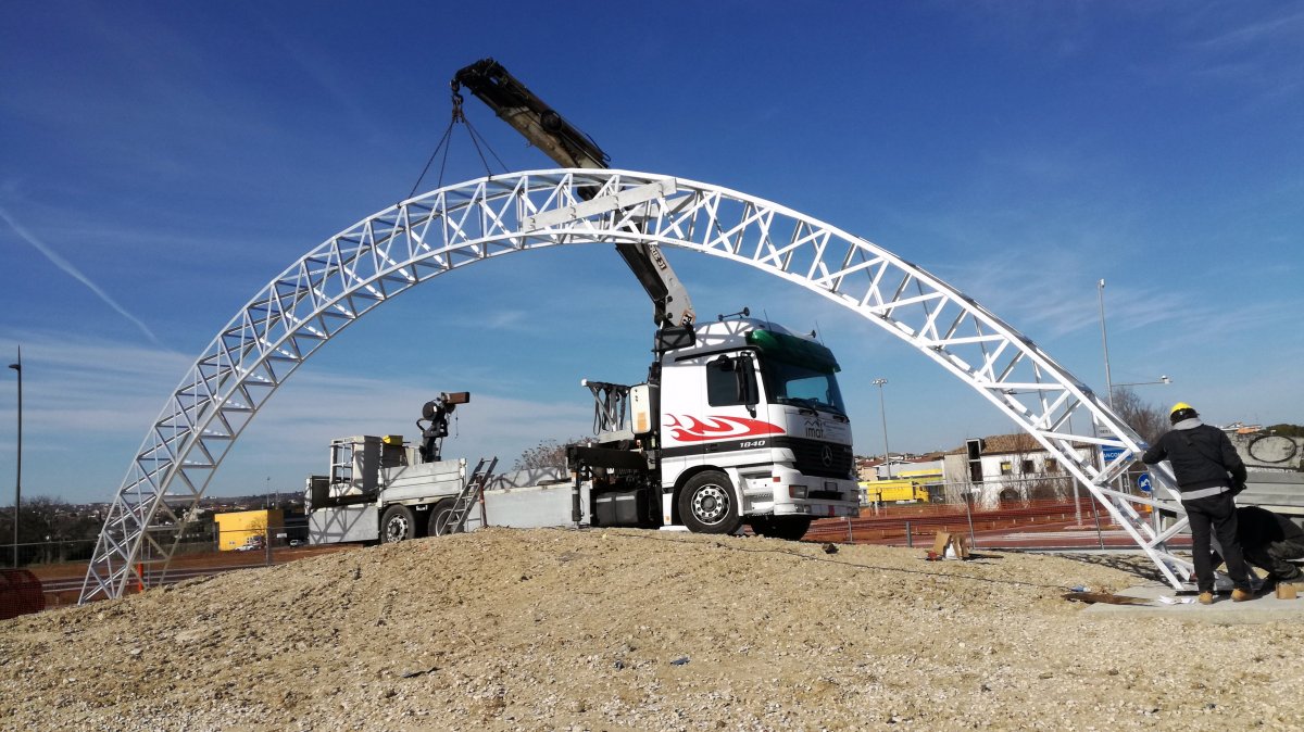 Caratterizzata da una struttura portante reticolare tridimensionale a sezione variabile in acciaio zincato e tamponata poi con pannelliAlucobond, questa opera artistica si trova posizionata sopra una rotonda stradale.