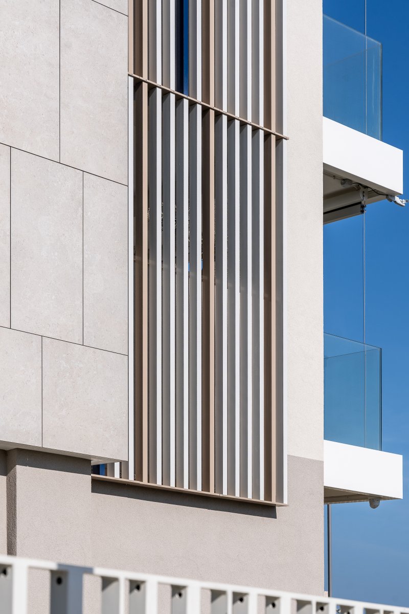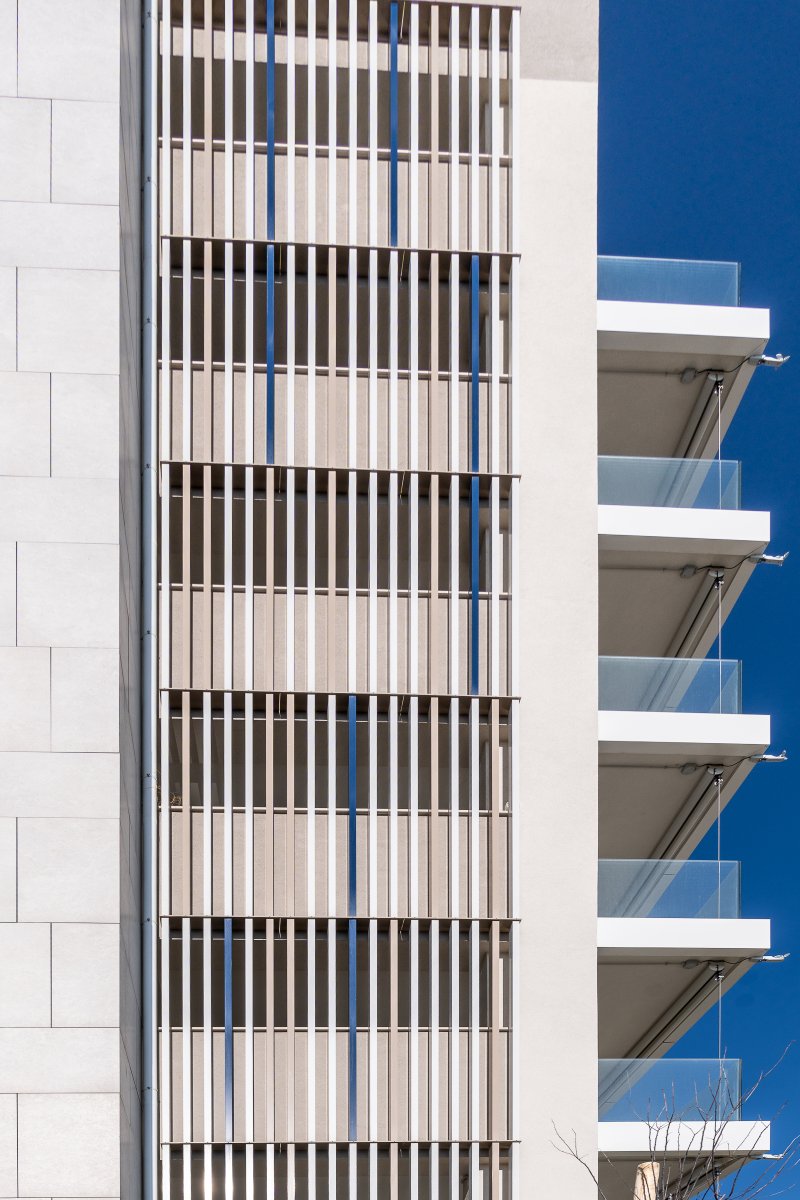 Nelle pareti laterali degli edifici, si possono notare i colorati frangisole verticali. Che oltre ad avere una funzione di attenuazione della luce solare, offrono un particolare gioco di luci e colori, soprattutto nelle giornate di sole